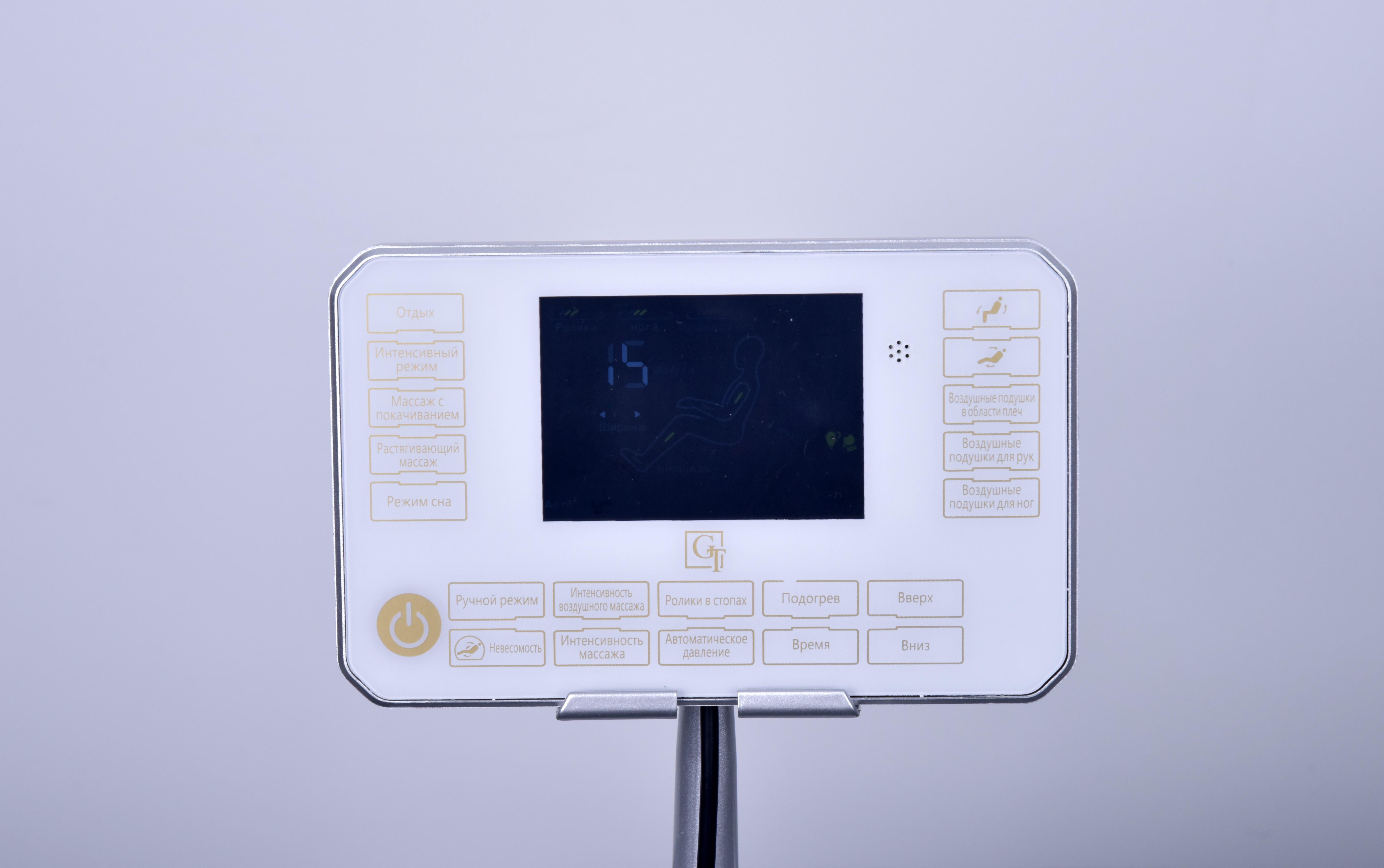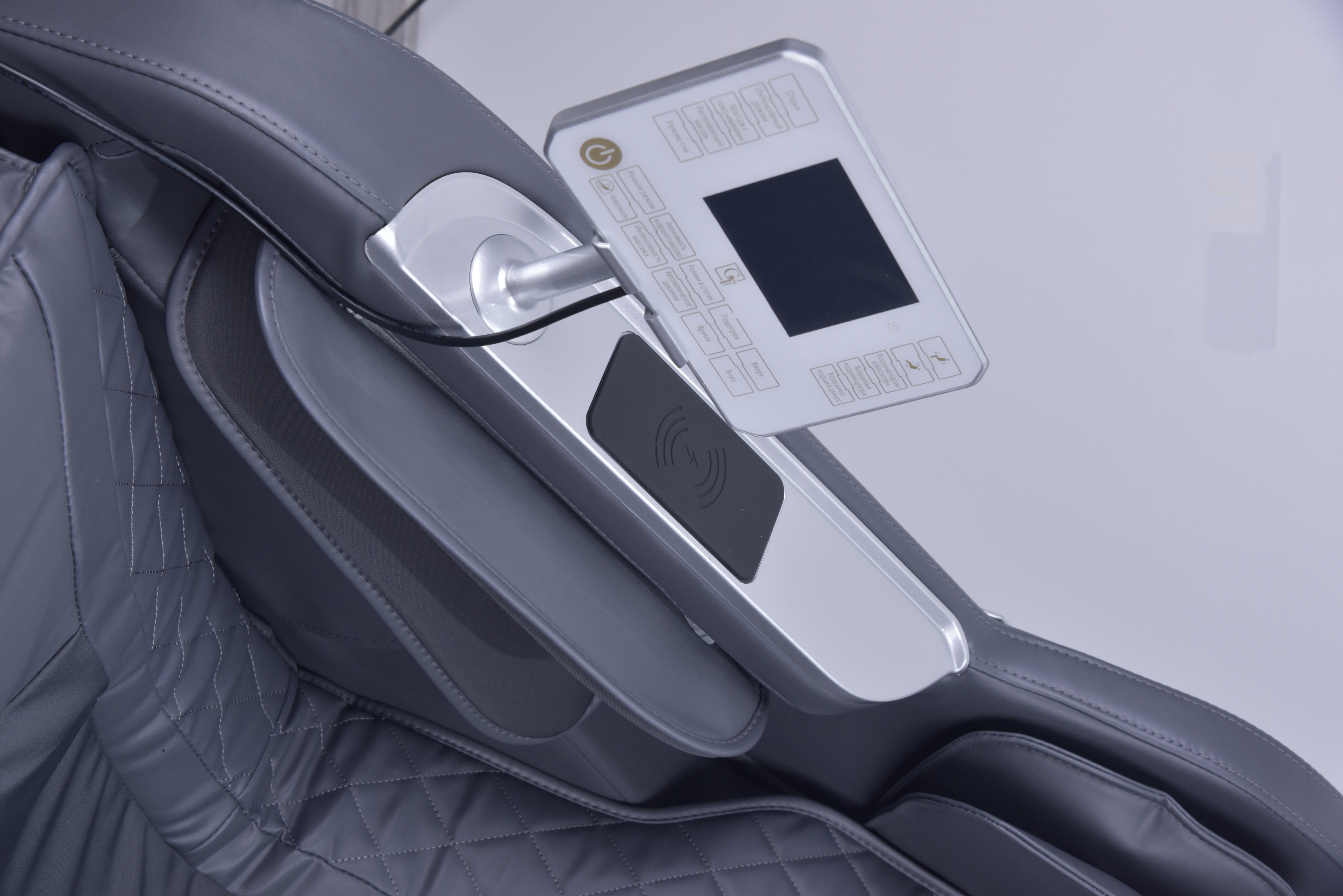Кресло GT K35 предоставляет подлокотники с быстрыми клавишами для управления, а также функцию беспроводной зарядки для вашего телефона. 7-дюймовый ЖК-экран и сенсорное управление делают настройку массажа простой и интуитивно понятной.