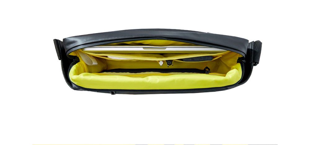 Ремень сумки регулируется по длине. Внутри расположен карман для ноутбука и несколько карманов поменьше – для всевозможных аксессуаров, документов и гаджетов. А в основное пространство легко поместится сложенный худи, термос или увесистая пачка документов. Снаружи есть дополнительный отсек на молнии, а открыть основной отсек, когда сумка на плече, невозможно, не привлекая внимания владельца.