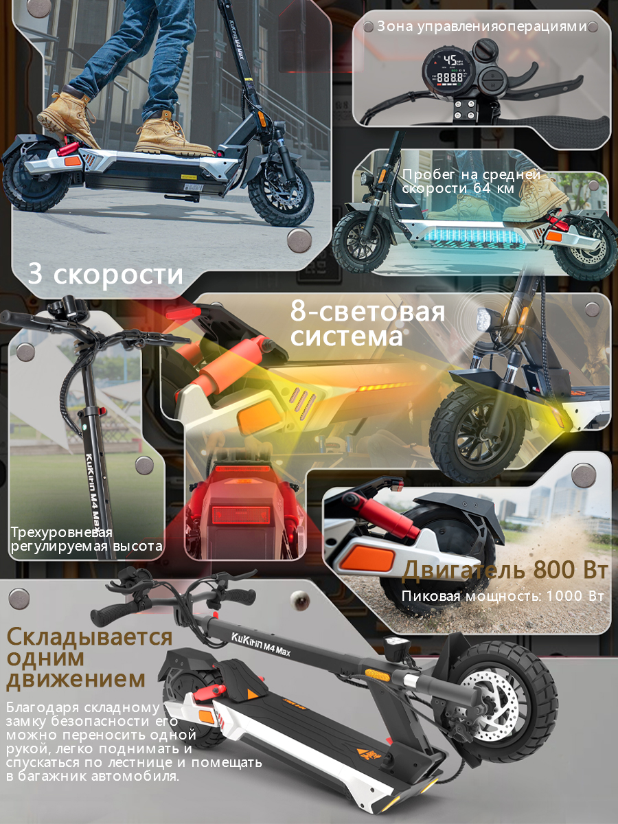 Регулируемая высота рулевой колонки позволяет адаптировать самокат под рост водителя, делая его удобным для использования как взрослыми, так и подростками. Полный привод и большие колеса делают Kukirin M4 Max отличным выбором для быстрого и комфортного передвижения по городу. Модель сочетает мощность, устойчивость и удобство для ежедневного использования.