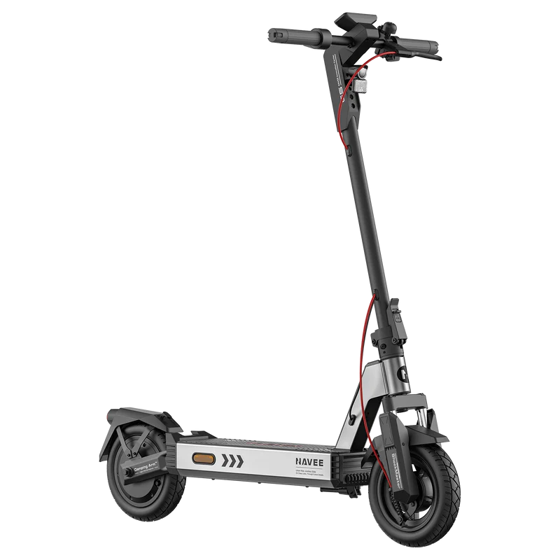 Электросамокат Navee G5 Pro оснащен 10-дюймовыми бескамерными шинами, которые обеспечивают отличную устойчивость и полностью исключают риск внезапного прокола. Передняя вилка и задний рычаг образуют полноценную двухточечную подвеску, эффективно поглощающую удары от ям, кочек и стыков асфальта. Вес самоката составляет 20 кг, что является оптимальным показателем для модели с усиленной подвеской и складной рамой.