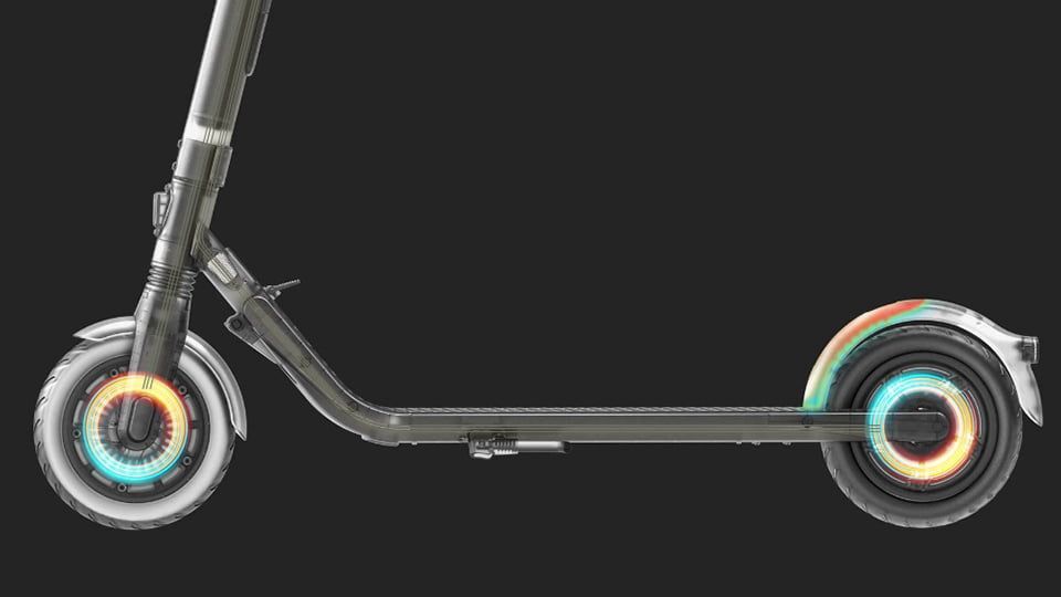 В нижней части деки электросамоката размещены RGB-светодиоды. С помощью фирменного приложения Ninebot вы можете выбрать любой из тысяч цветов подсветки и даже настроить её анимацию – мы предусмотрели 9 режимов. Кроме декоративной функции подсветка обеспечивает также дополнительную безопасность при передвижении в тёмное время суток.