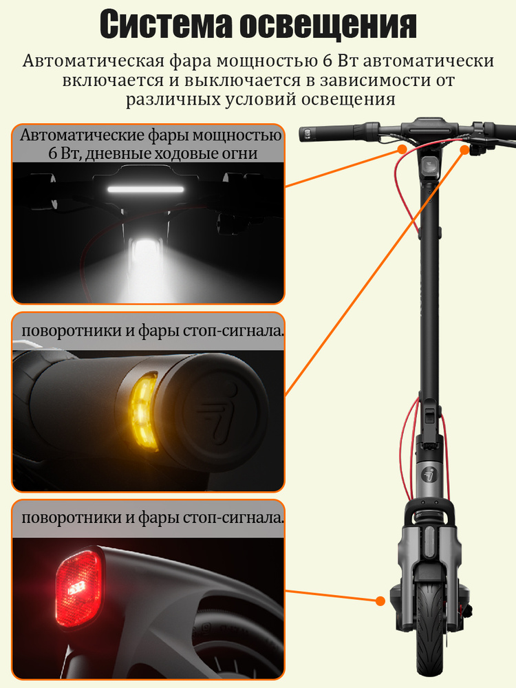 Ninebot Kickscooter F3 оборудован двойной системой торможения, которая включает в себя электрическое и механическое тормоза. Это обеспечивает надежное и быстрое торможение в любых условиях, повышая безопасность пользователя.Электросамокат оснащен яркими передними и задними фарами, что обеспечивает видимость в темное время суток и повышает безопасность при передвижении.