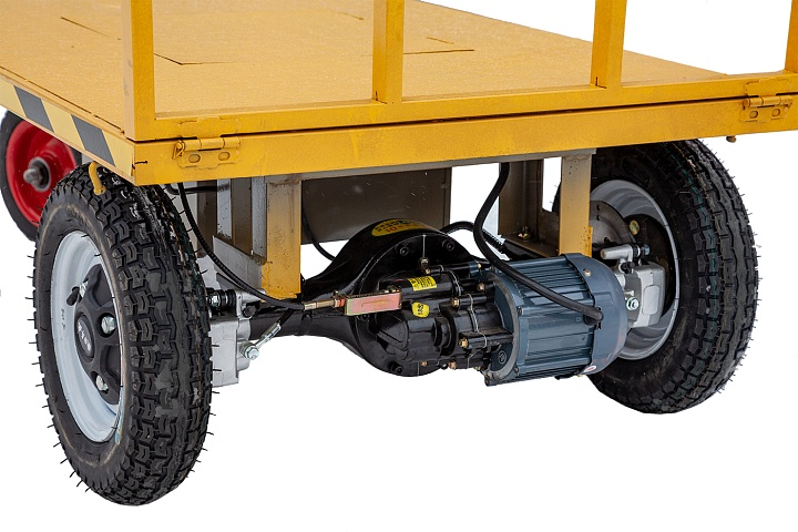 Тележка оснащена тяговыми необслуживаемыми AGM VRLA аккумуляторами емкостью 20Ah, что обеспечивает пробег до 20 км на одной зарядке. Сухой вес устройства составляет 110 кг, что гарантирует хорошую маневренность при высокой прочности.