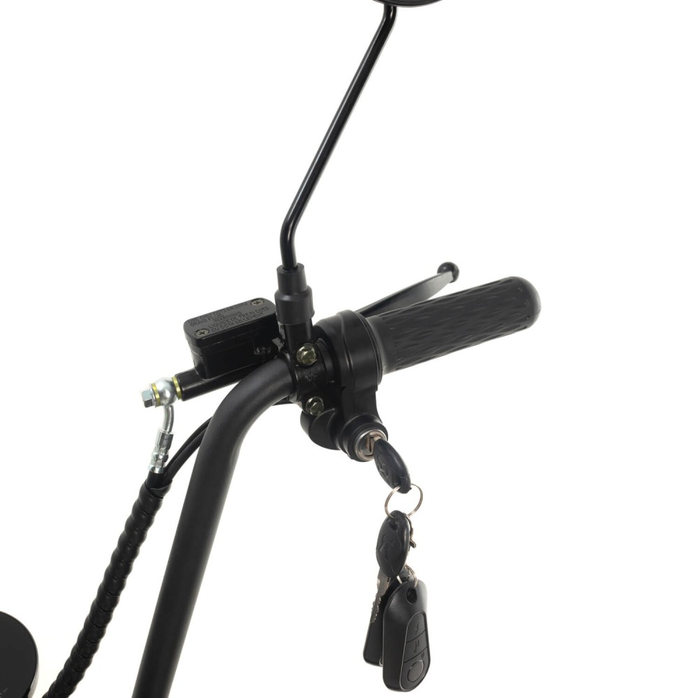 Электроскутер оснащен удобным сиденьем и подножкой, что делает его идеальным выбором для длительных поездок. Нескладная рама придает конструкции дополнительную прочность и устойчивость, что особенно важно для пользователей, которые планируют активно использовать транспортное средство. Сиденье обеспечивает комфорт даже во время длительных поездок, позволяя вам наслаждаться каждой минутой на дороге.