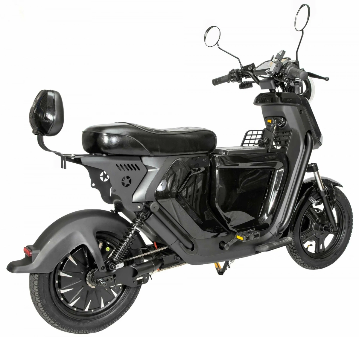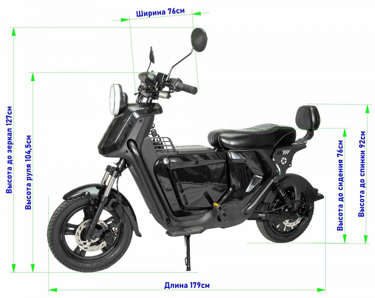 Электроскутер оборудован сиденьем и подножкой для дополнительного комфорта. Корпус выполнен из стали, что обеспечивает прочность и долговечность конструкции. Дисплей позволяет отслеживать важные параметры во время поездки, а передние и задние поворотники обеспечивают безопасность на дороге.