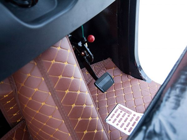 Управление осуществляется с помощью ручки газа, что обеспечивает простоту и удобство в эксплуатации. Тормозная система включает барабанные тормоза как спереди, так и сзади, что гарантирует надежное торможение и безопасность на дороге.