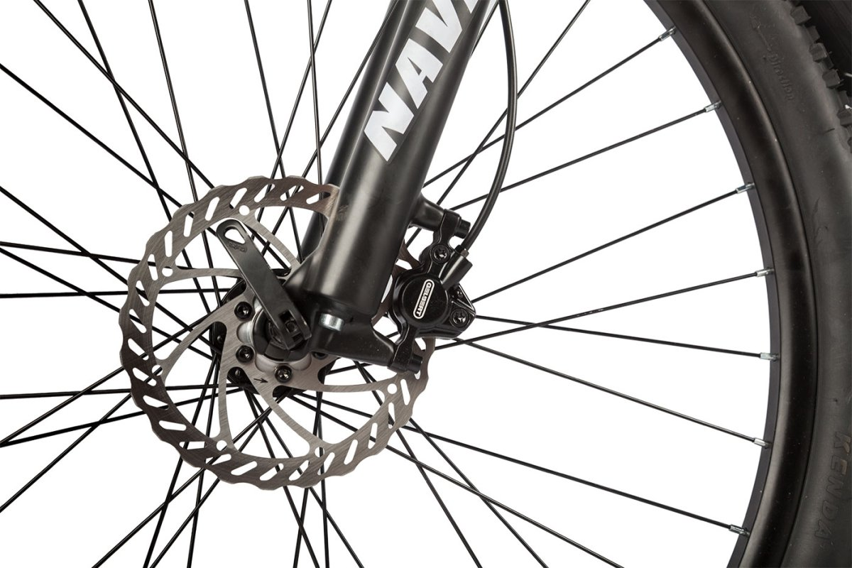Электровелосипед оснащен дисковыми механическими тормозами как спереди, так и сзади, что обеспечивает высокую эффективность торможения. Эта система значительно повышает уровень безопасности при движении, особенно на сложных маршрутах.