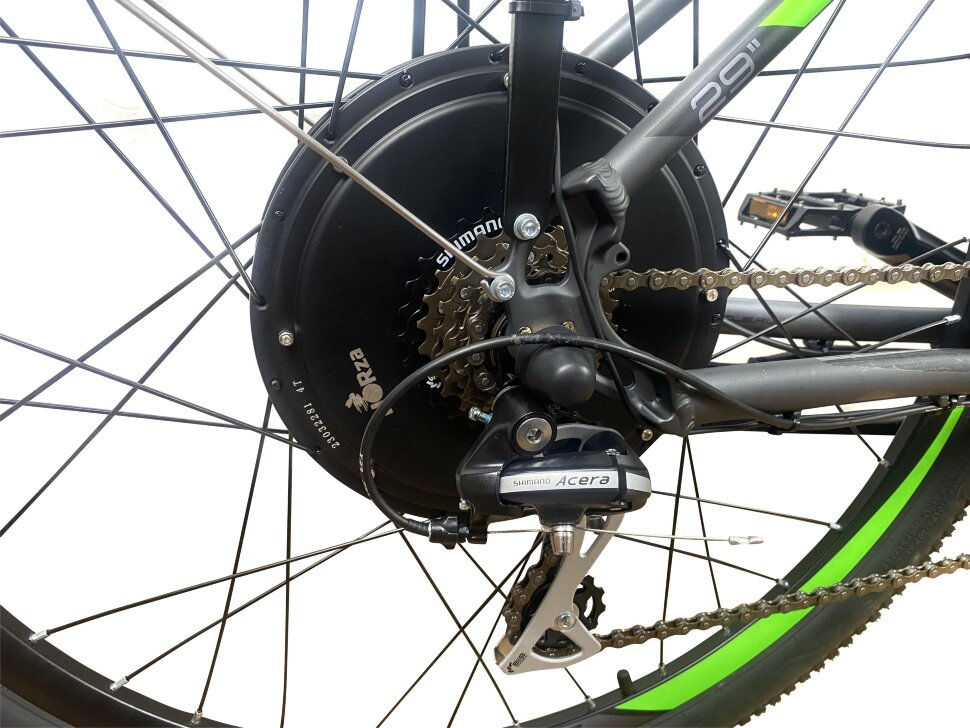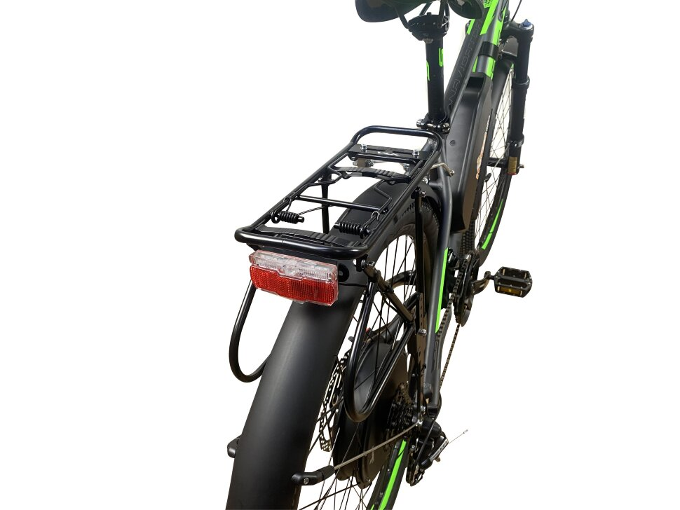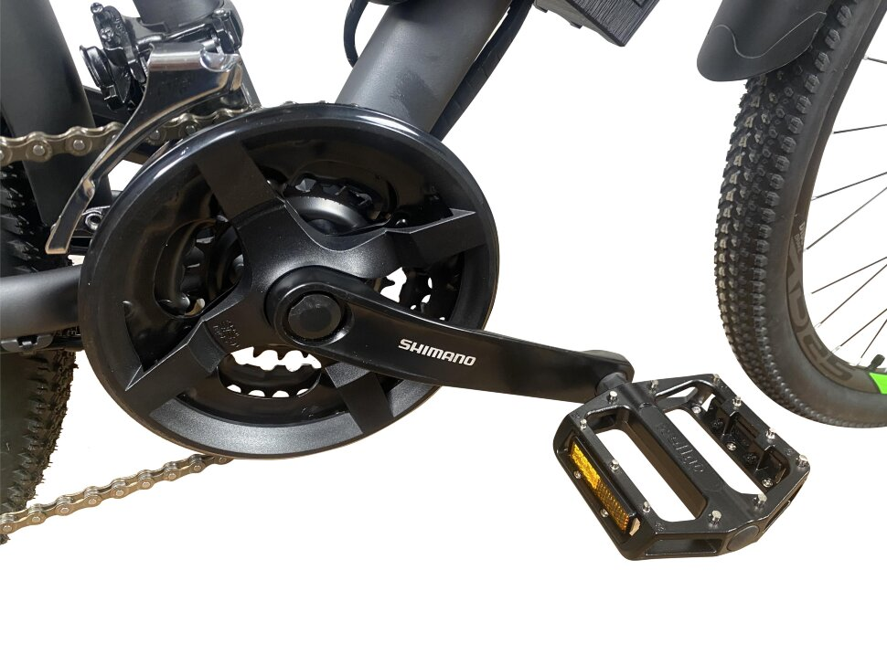 Электровелосипед оборудован колесами размером 27.5 х 2.8 дюйма, что обеспечивает отличную проходимость и устойчивость на различных типах местности. Широкие шины способствуют лучшему сцеплению с дорогой, что особенно важно при движении по сложным маршрутам.