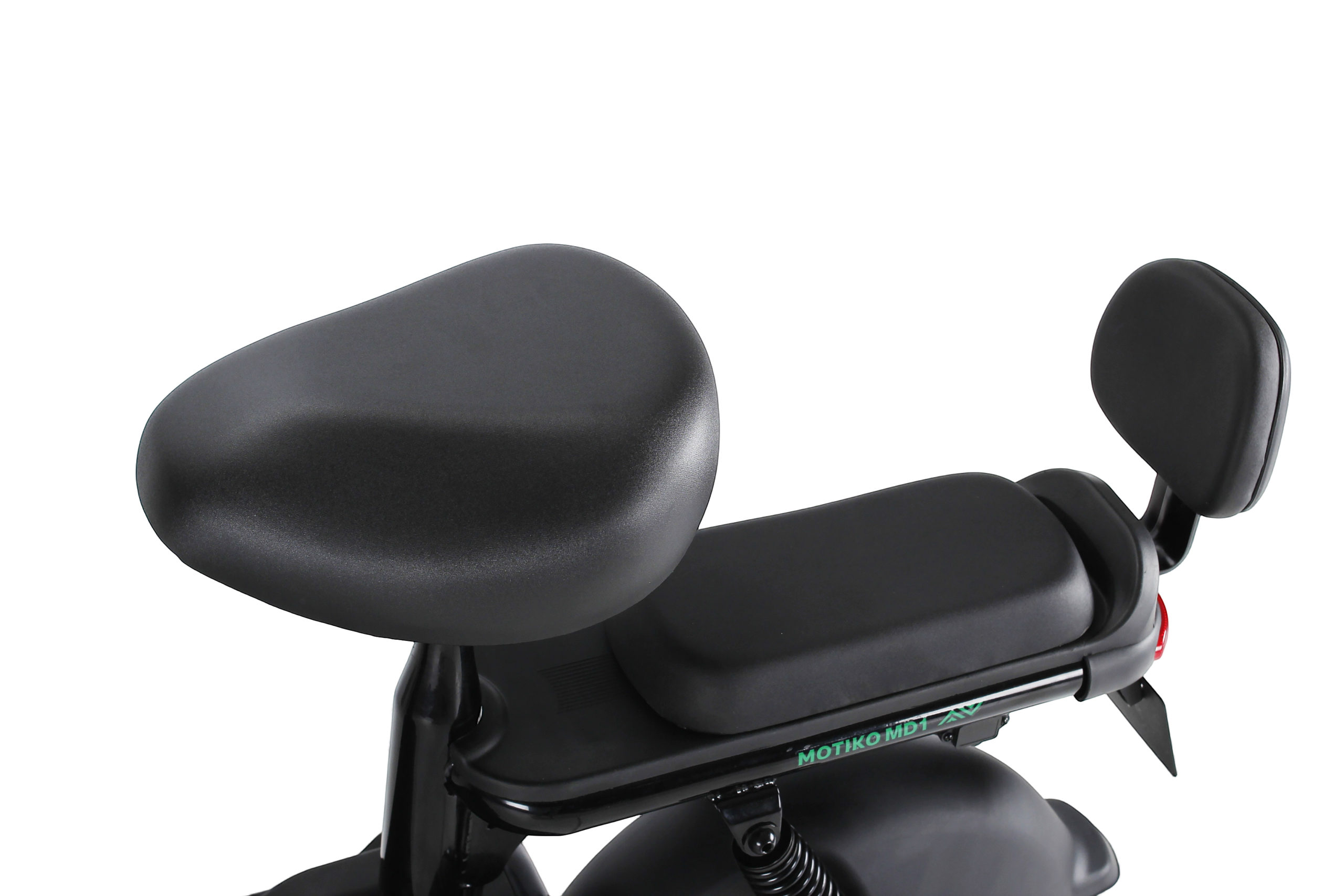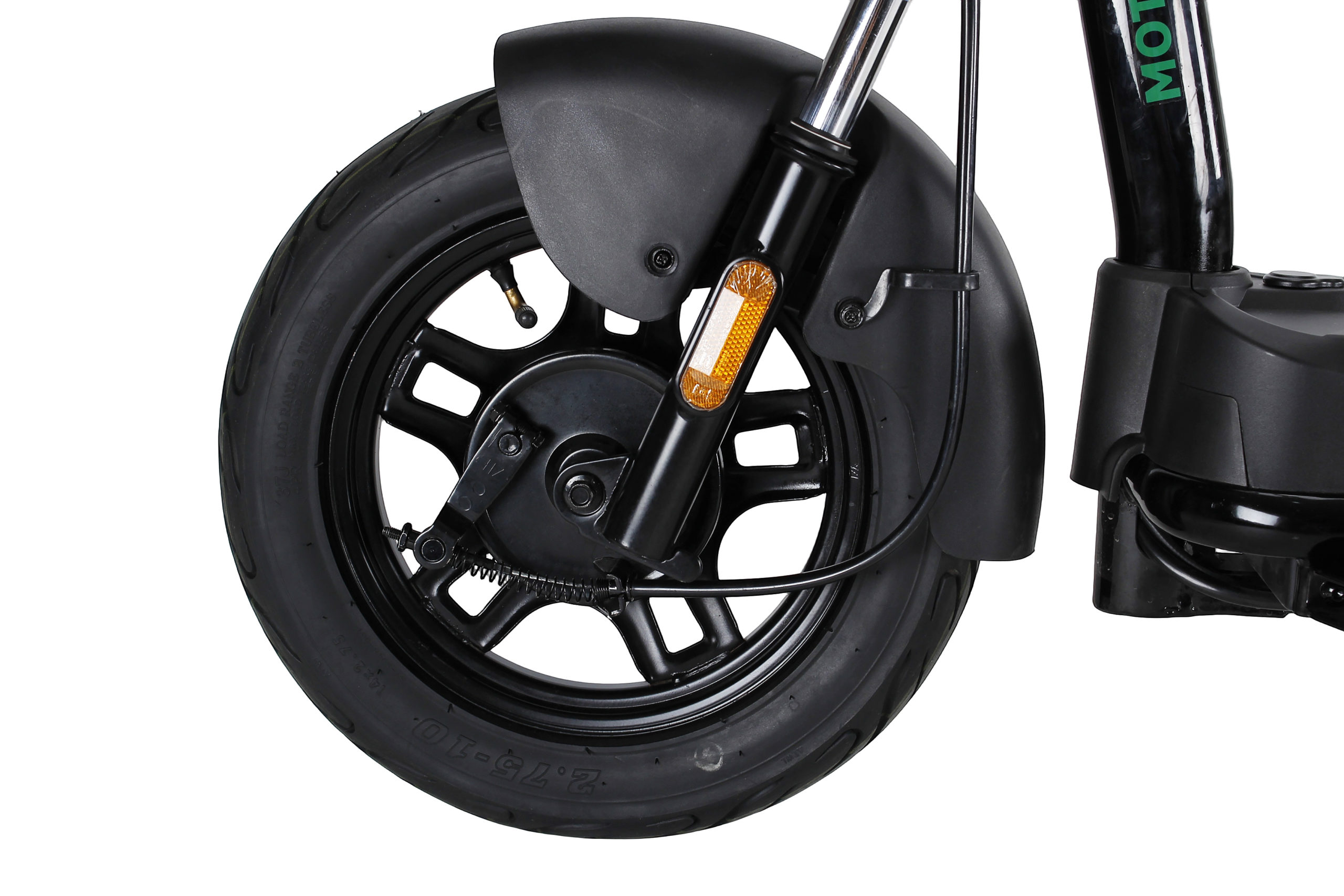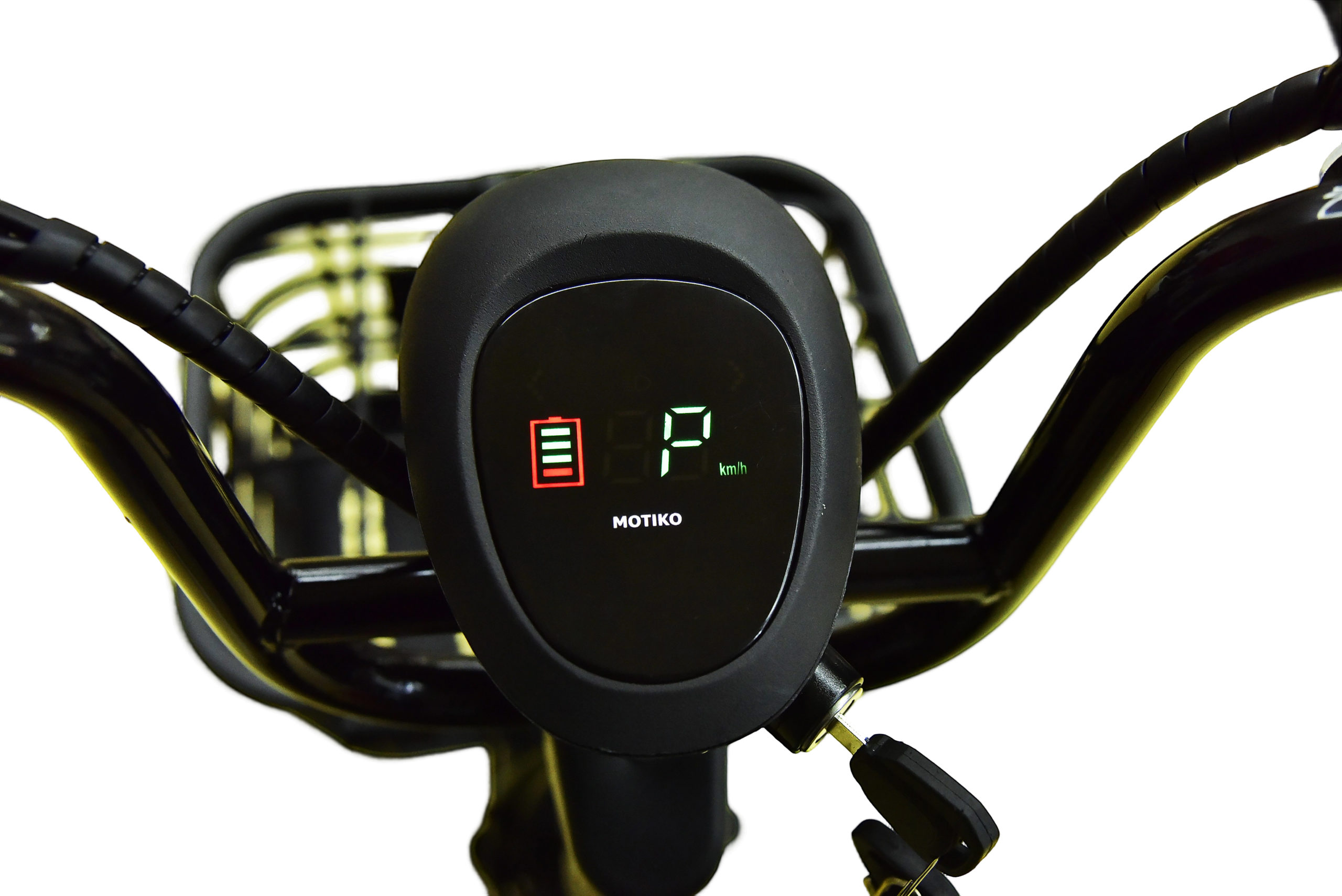 Электровелосипед MOTIKO MD1 создан на базе 14-дюймовых колес, раме в черно-зеленом исполнении, которая сочетает компактность с современным дизайном. Малый диаметр колес и укороченная колесная база обеспечивают превосходную маневренность в плотном городском потоке и упрощают парковку в ограниченном пространстве. Максимальная нагрузка составляет 120 кг, что позволяет использовать велосипед водителям с разной комплекцией.