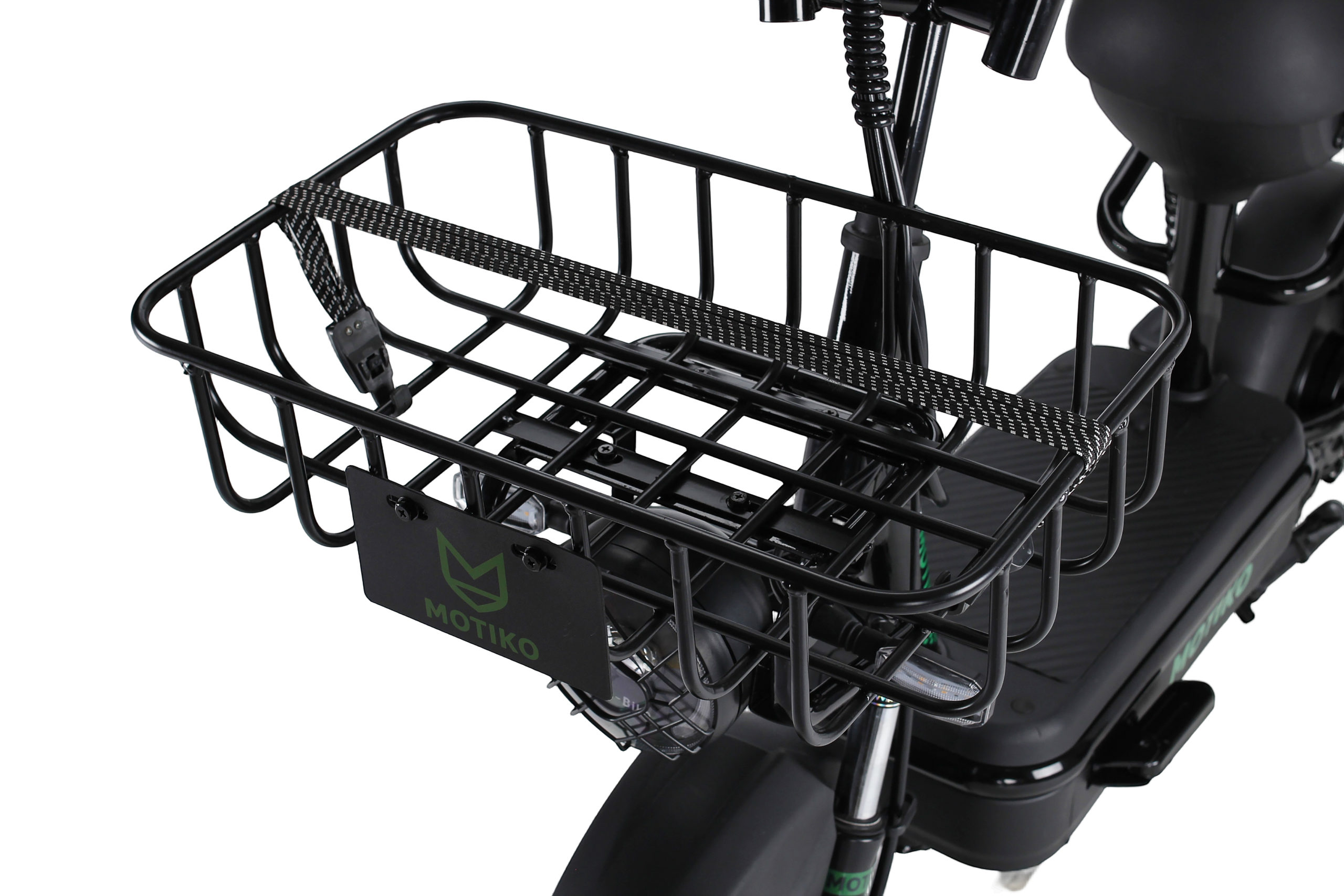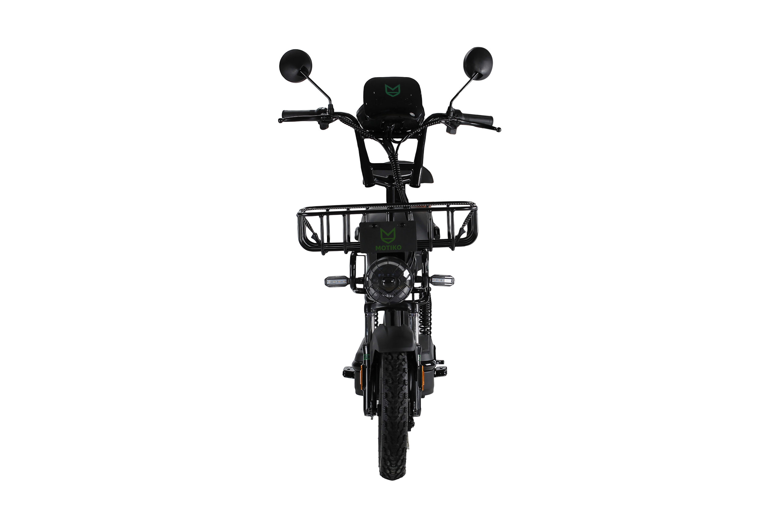 Электровелосипед MOTIKO MQ3 выполнен на 14-дюймовых колесах в черно-зеленой цветовой гамме, сочетающей стильный внешний вид с практичностью для городских условий. Небольшой размер рамы обеспечивает отличную маневренность в плотном потоке и удобство хранения в малогабаритных помещениях. Максимальная нагрузка составляет 120 кг, что позволяет комфортно использовать велосипед большинству водителей.