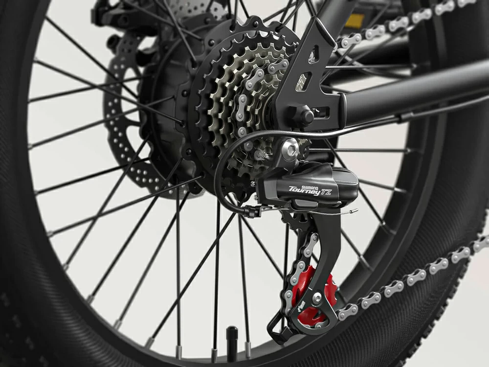 Задний привод мощностью 500 Ватт обеспечивает уверенное движение по различным типам покрытия, включая песок, гравий, снег и грязь. Электродвигатель интегрирован в заднюю втулку, что сохраняет традиционную компоновку велосипеда и упрощает доступ к механическим узлам. Мощности достаточно для преодоления затяжных подъемов с полной нагрузкой и динамичного разгона до максимальной скорости 45 км/ч.