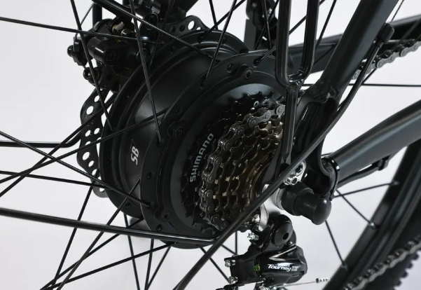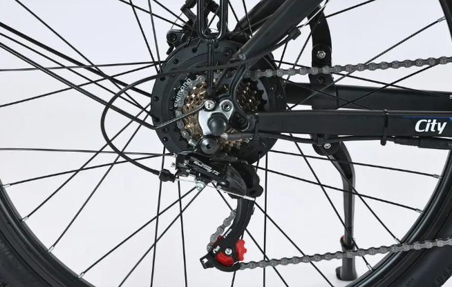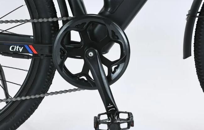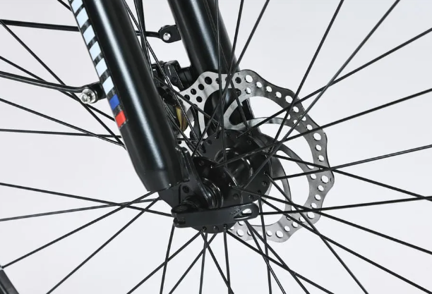 Двухколесная конструкция с диаметром колес 27.5 дюймов обеспечивает отличную устойчивость и комфорт при езде. Покрышки с камерой и дисковые механические тормоза спереди и сзади гарантируют надежное торможение и высокую безопасность в любых условиях, что особенно важно в городской среде.