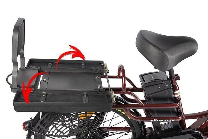 - мягкое сиденье на багажнике с откидывающейся спинкой и трансформирующейся конструкцией. Вы также можете установить на багажник детское кресло или закрепить груз, если ваш общий вес не будет превышать 130 кг.