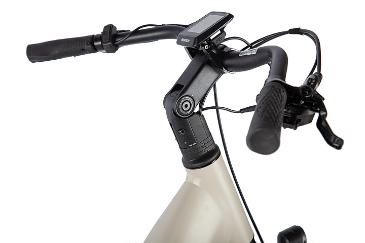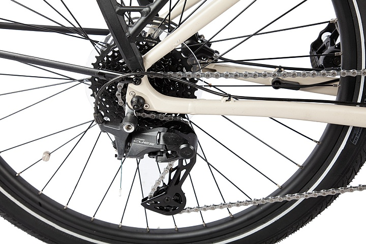 Электровелосипед оснащен центральным приводом и цепной передачей с 10 скоростями Shimano Cues, что позволяет легко адаптироваться к различным условиям дороги. Дисковые гидравлические тормоза диаметром 160 мм обеспечивают надежную остановку как спереди, так и сзади.