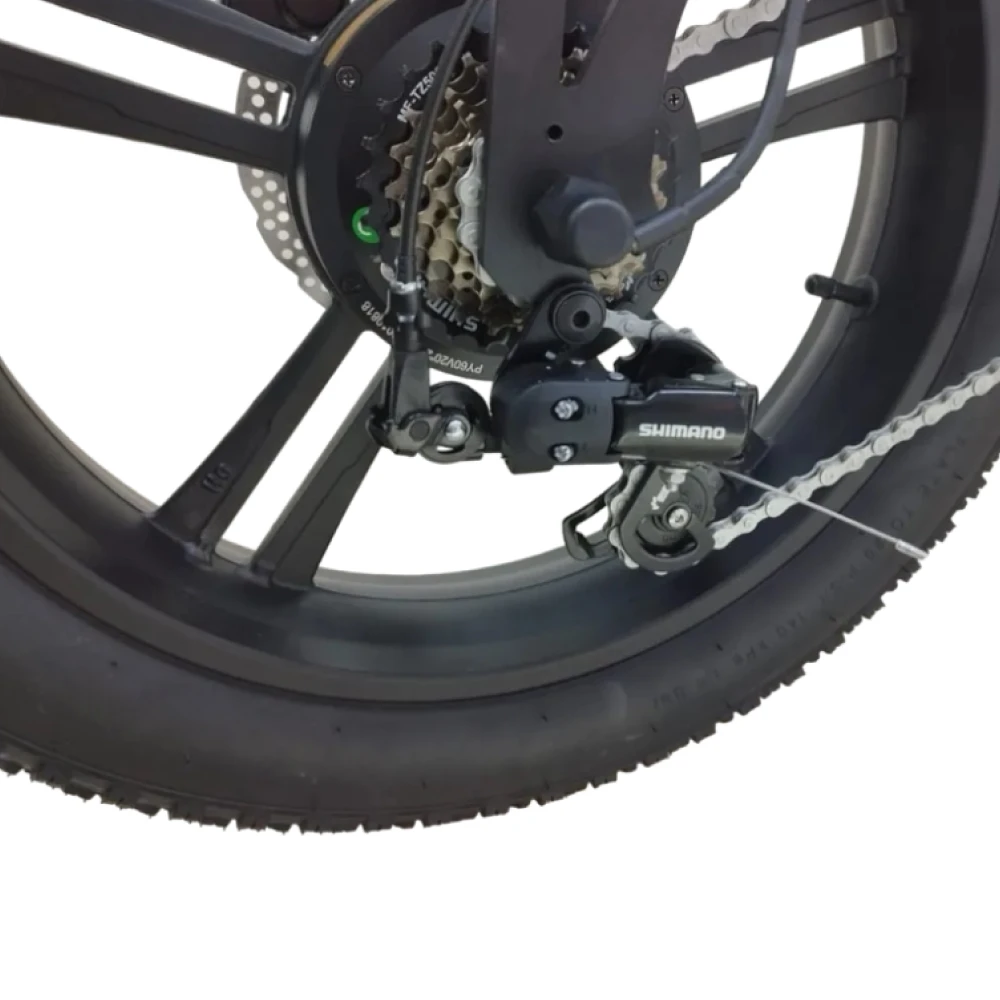 Электровелосипед оснащен гидравлическими тормозами как спереди, так и сзади, что обеспечивает безопасное и эффективное торможение в любых условиях. Диаметр колес составляет 20 дюймов с шириной 4.0 дюйма, что способствует отличному сцеплению с дорогой и комфорту во время поездки, а также позволяет легко преодолевать неровности.