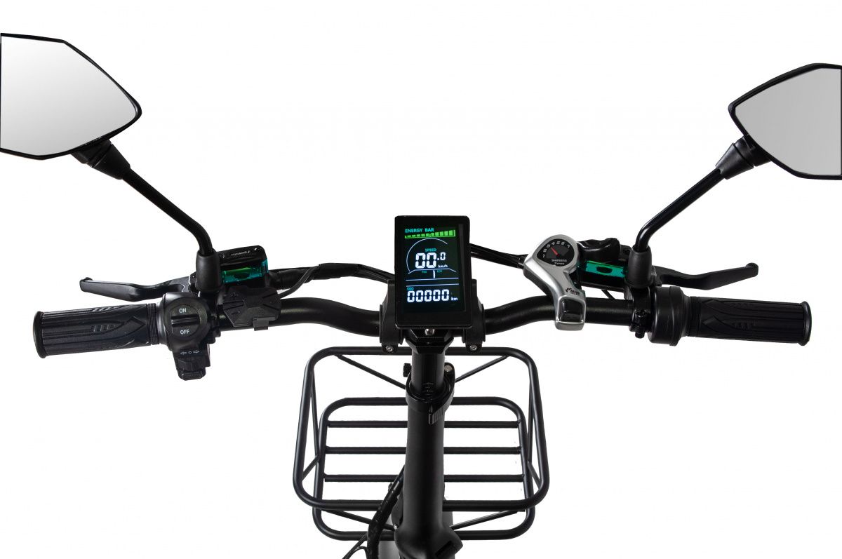Электровелосипед оснащен передней мягкой фарой и ходовыми огнями, что обеспечивает отличную видимость в темное время суток. Круиз-контроль позволяет поддерживать желаемую скорость без необходимости крутить педали, что делает поездки более комфортными и менее утомительными.