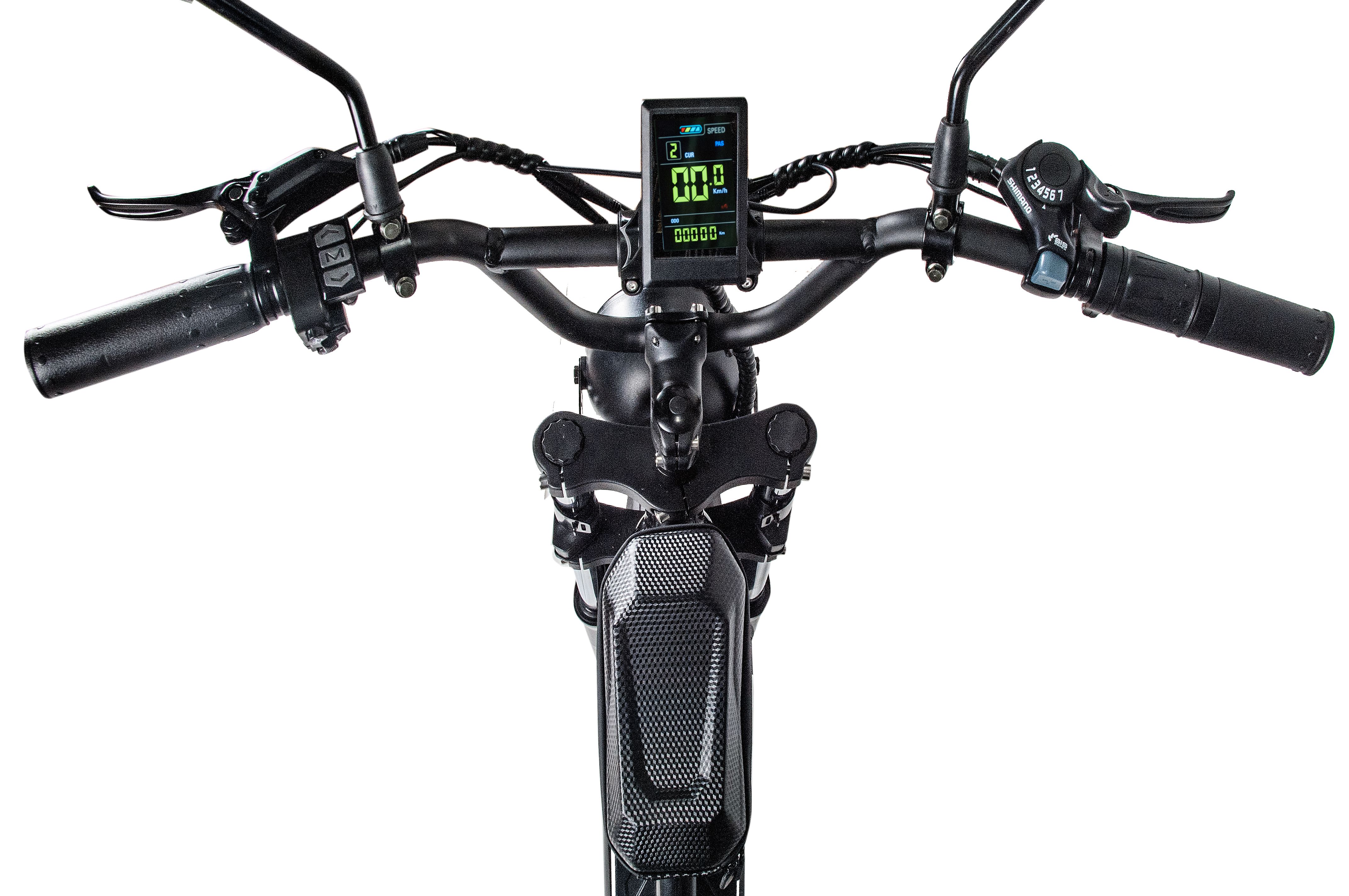 Для удобства на руле находится небольшой бардачок, в который можно убрать телефон или кошелёк. Также в рулевой части расположены: тормозные рычаги, информационный дисплей, кнопки управления подсветкой и курок газа. Дисковые тормоза обеспечат электронному велосипеду безопасную остановку практически на любой поверхности. Передняя яркая фара и задний габаритный огонь сделают очень комфортной поездку в вечернее время.