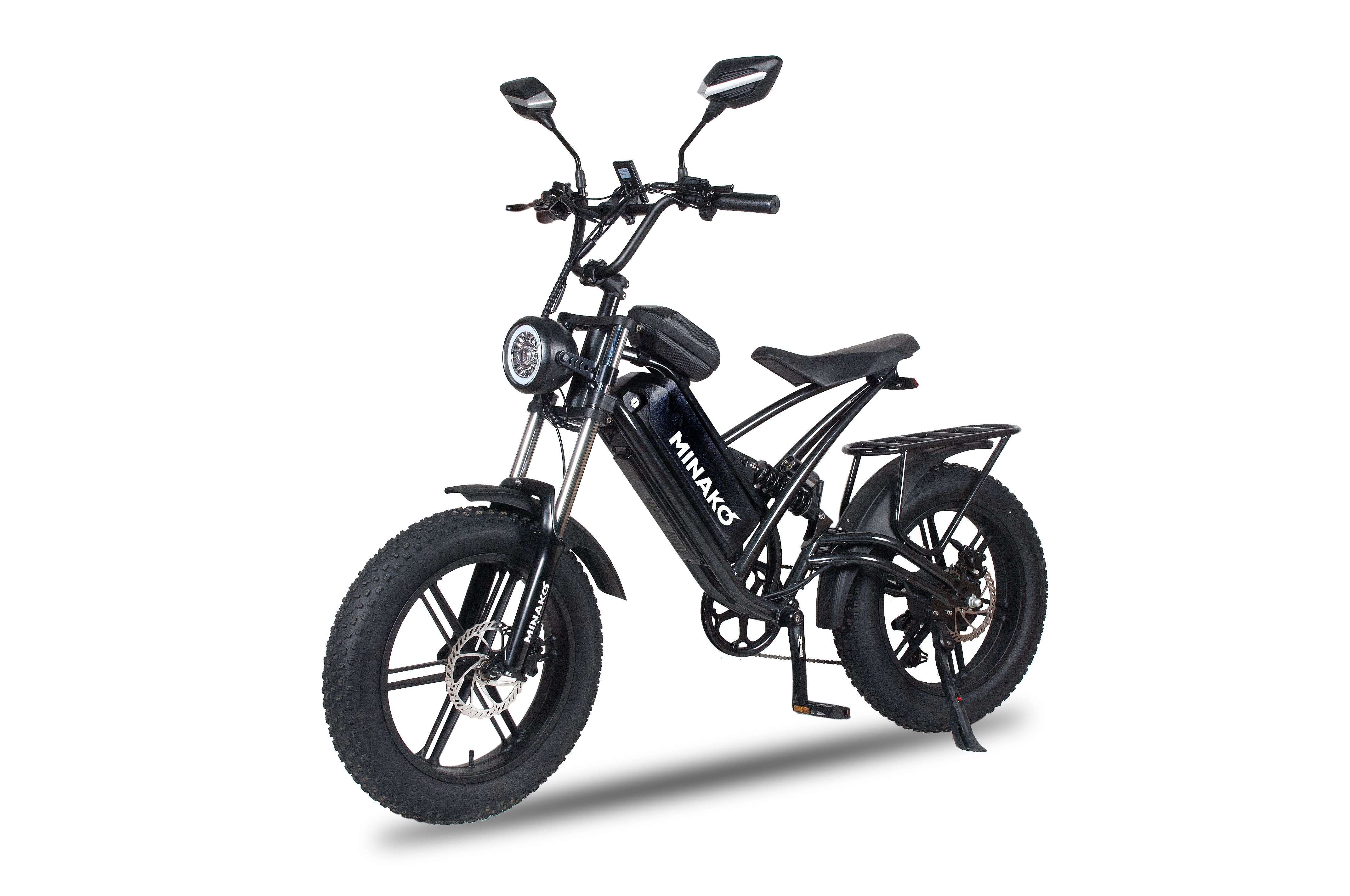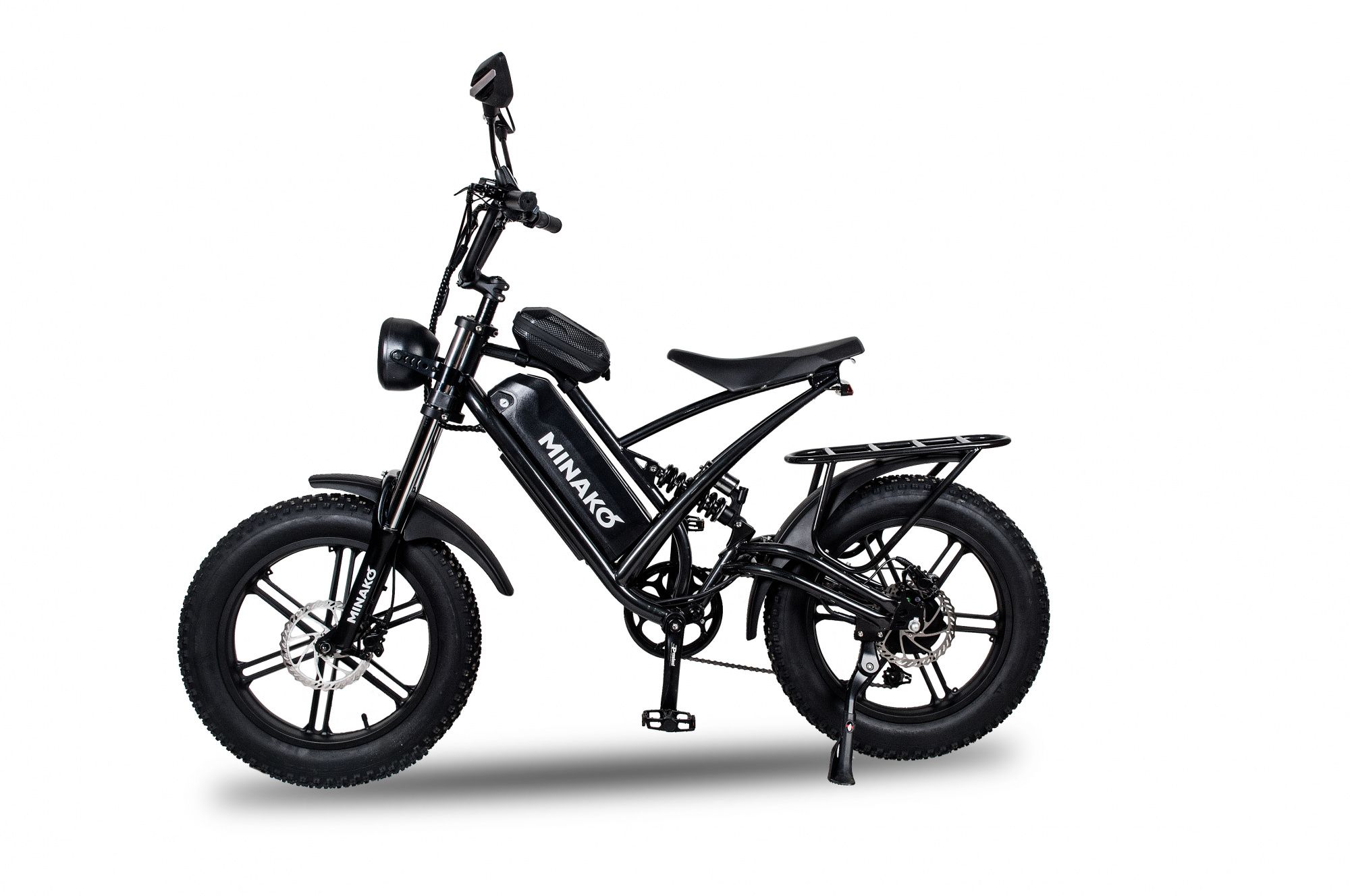 Минако ФОКС оборудован мощным мотором на 100 ватт, с ним вы сможете взбираться на самые крутые подъёмы и разгоняться до 55 км/ч. Вы сможете кататься на электрофэтбайке продолжительное время без усталости за счёт удобного сиденья. В задней части электровектровелосипеда есть вместительный багажник для перевоза пассажиров или вещей.