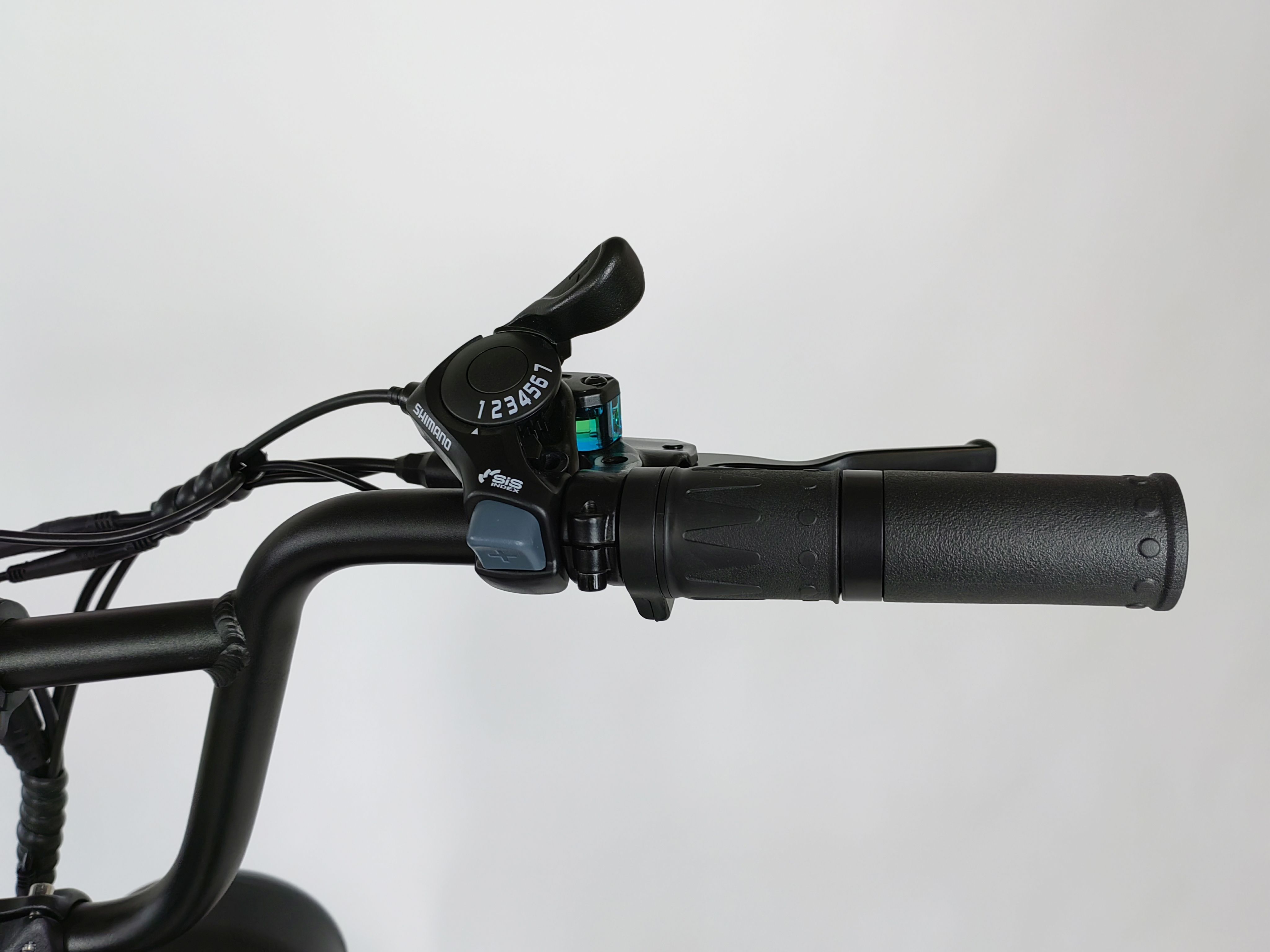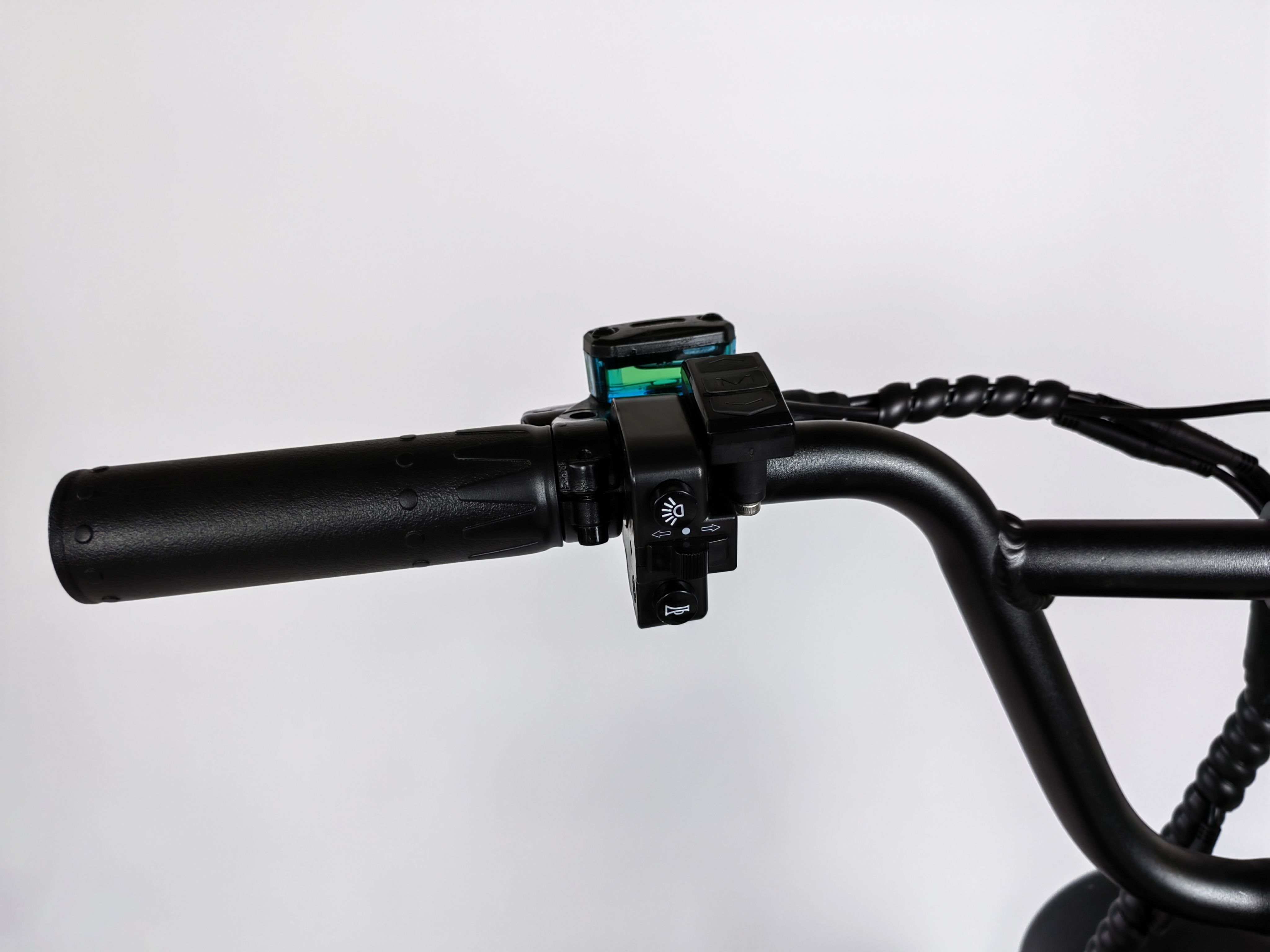 Для удобства на руле находится небольшой бардачок, в который можно убрать телефон или кошелёк. Также в рулевой части расположены: тормозные рычаги, информационный дисплей, кнопки управления подсветкой и курок газа. Дисковые тормоза обеспечат электронному велосипеду безопасную остановку практически на любой поверхности. Передняя яркая фара и задний габаритный огонь сделают очень комфортной поездку в вечернее время.