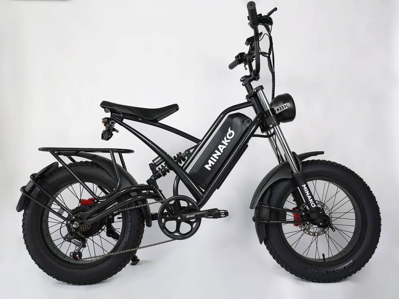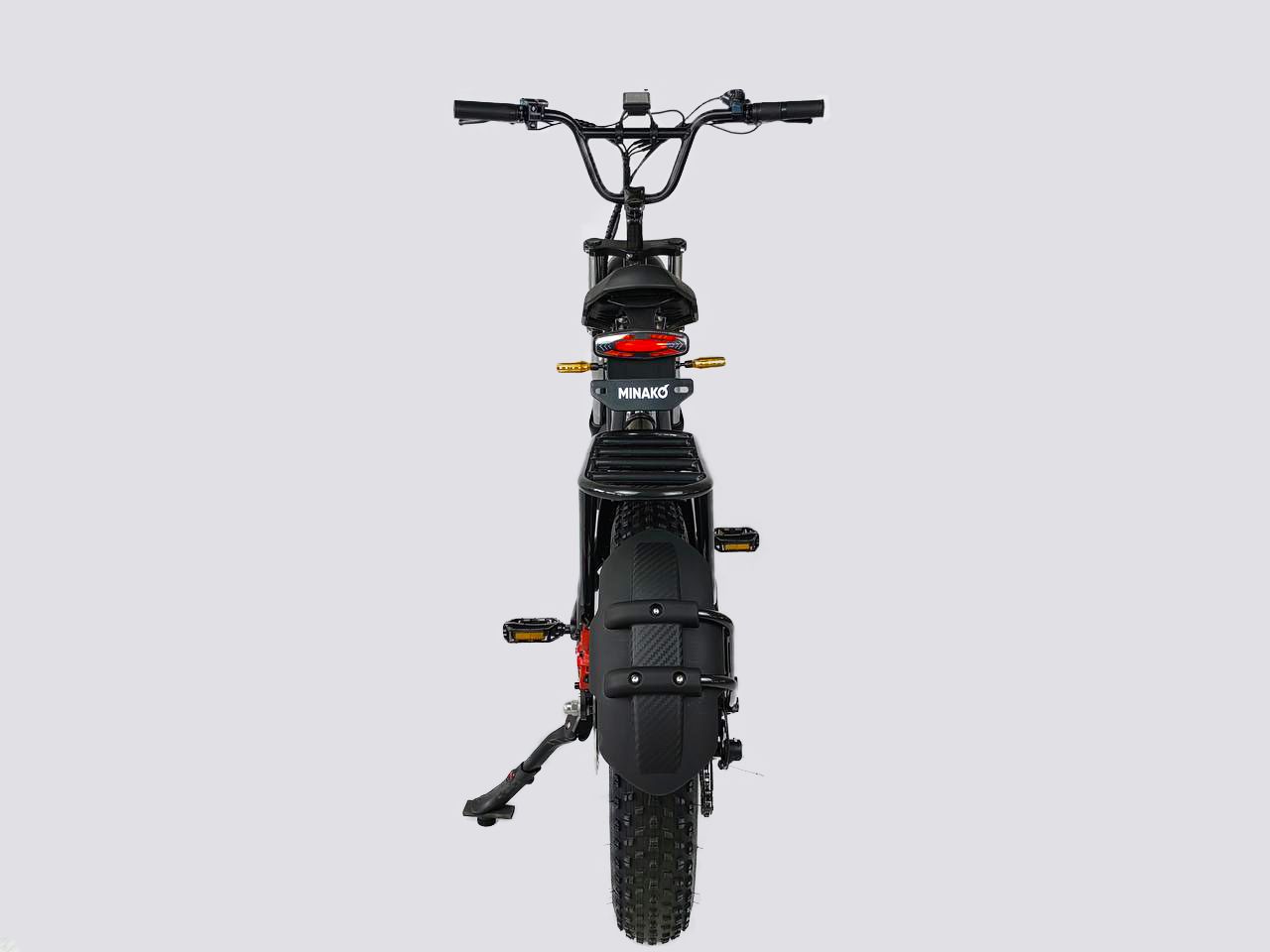 Минако ФОКС оборудован мощным мотором на 100 ватт, с ним вы сможете взбираться на самые крутые подъёмы и разгоняться до 55 км/ч. Вы сможете кататься на электрофэтбайке продолжительное время без усталости за счёт удобного сиденья. В задней части электровектровелосипеда есть вместительный багажник для перевоза пассажиров или вещей.